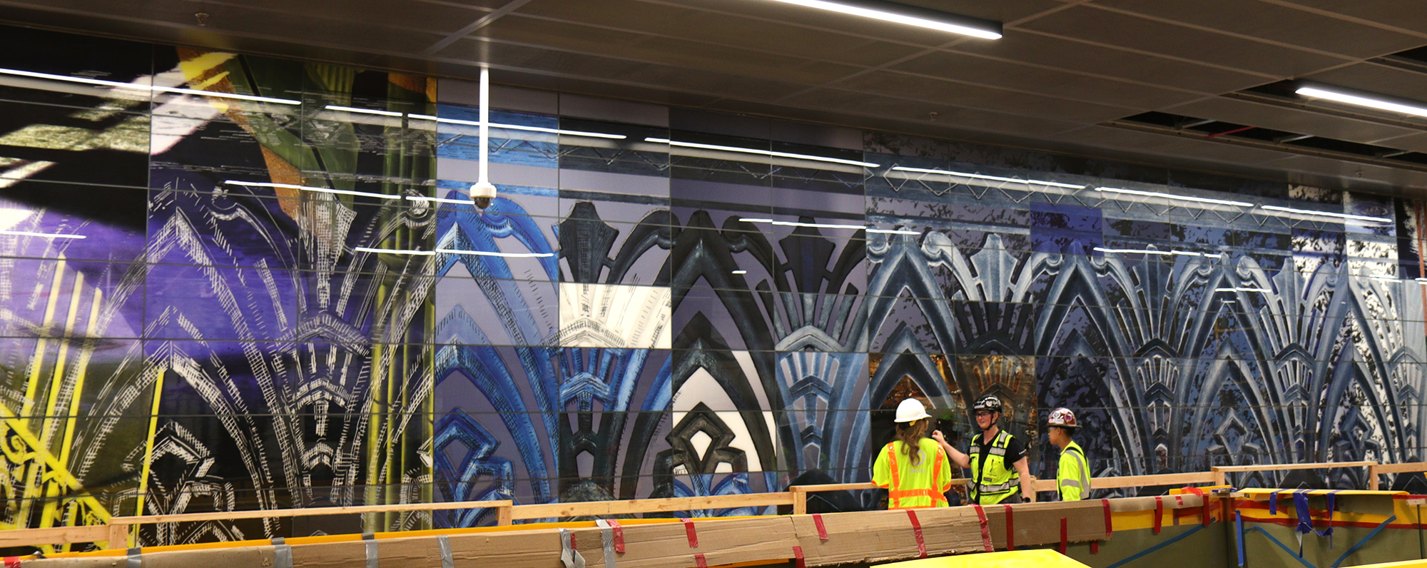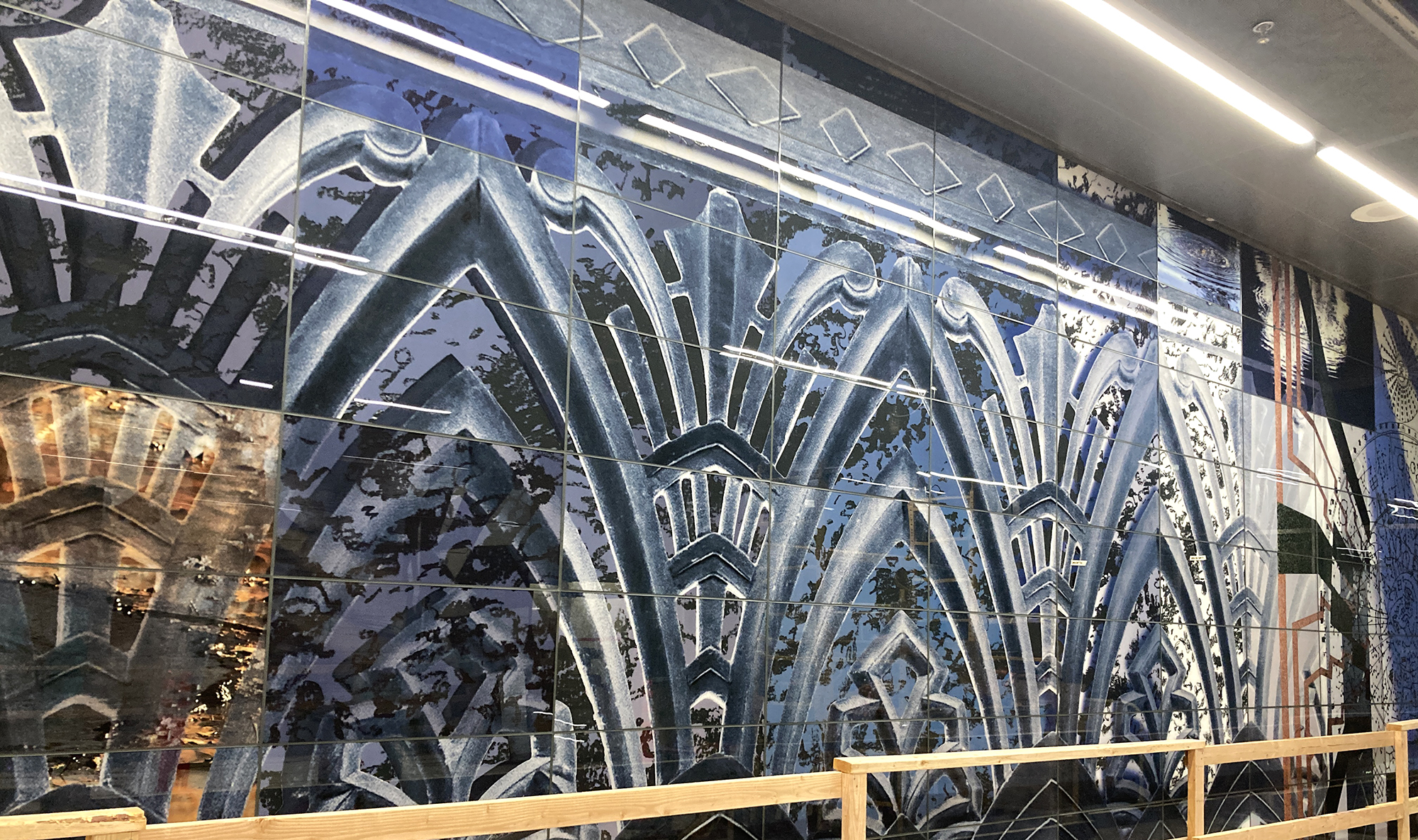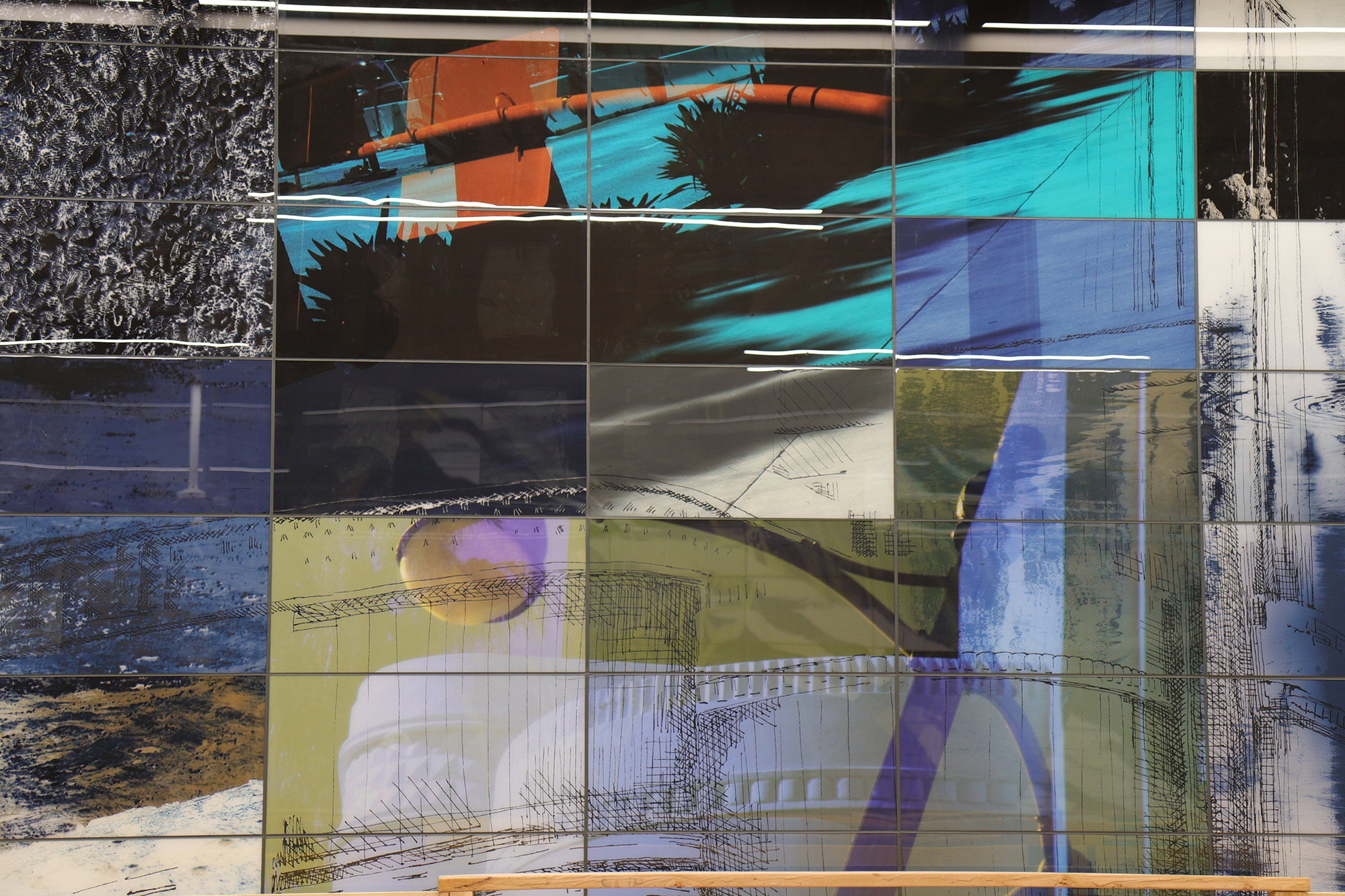 Two glass tiled murals for the La Brea Wilshire Metro Concourse currently in construction to be opened 2026. Two glass tiled murals for the La Brea Wilshire Metro Concourse currently in construction to be opened 2026. Drawn and Photographed Images through Dichroic lenses based on local architectural details, La Brea Tar Pits, ancient findings underground during the construction, Fung Shui objects in the Korean Cultural Center and observations of daylight up and down Wilshire Blvd.