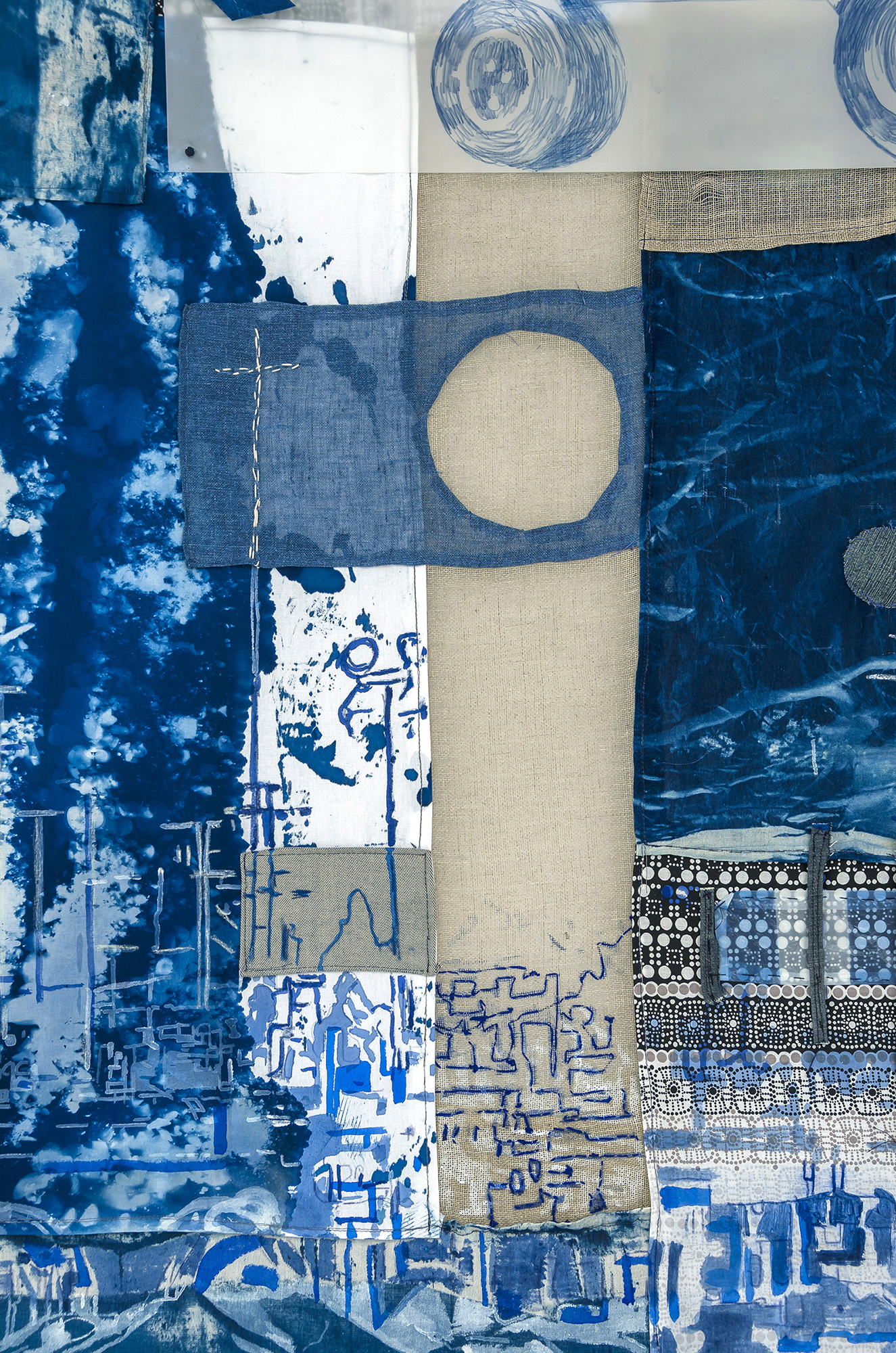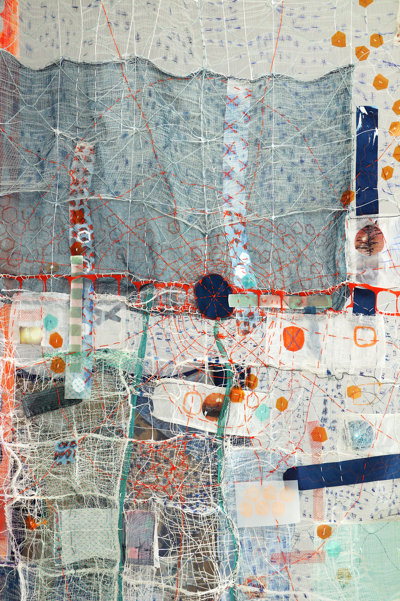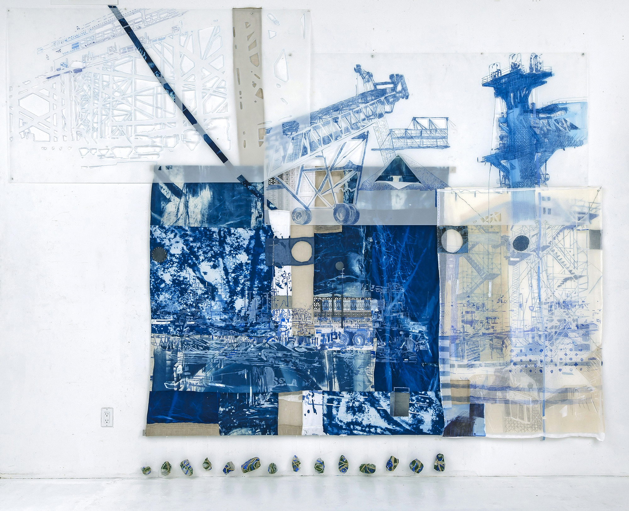 Pigment, crayon, cyanotype, image transfer and embroidery on cotton scrim (5 densities), vinyl, denim, patterned fabric, paper, cut drafting film. with paper mache and string extension. suspended 4” away from the wall by metal brackets, 108 x 130 x 8 inches