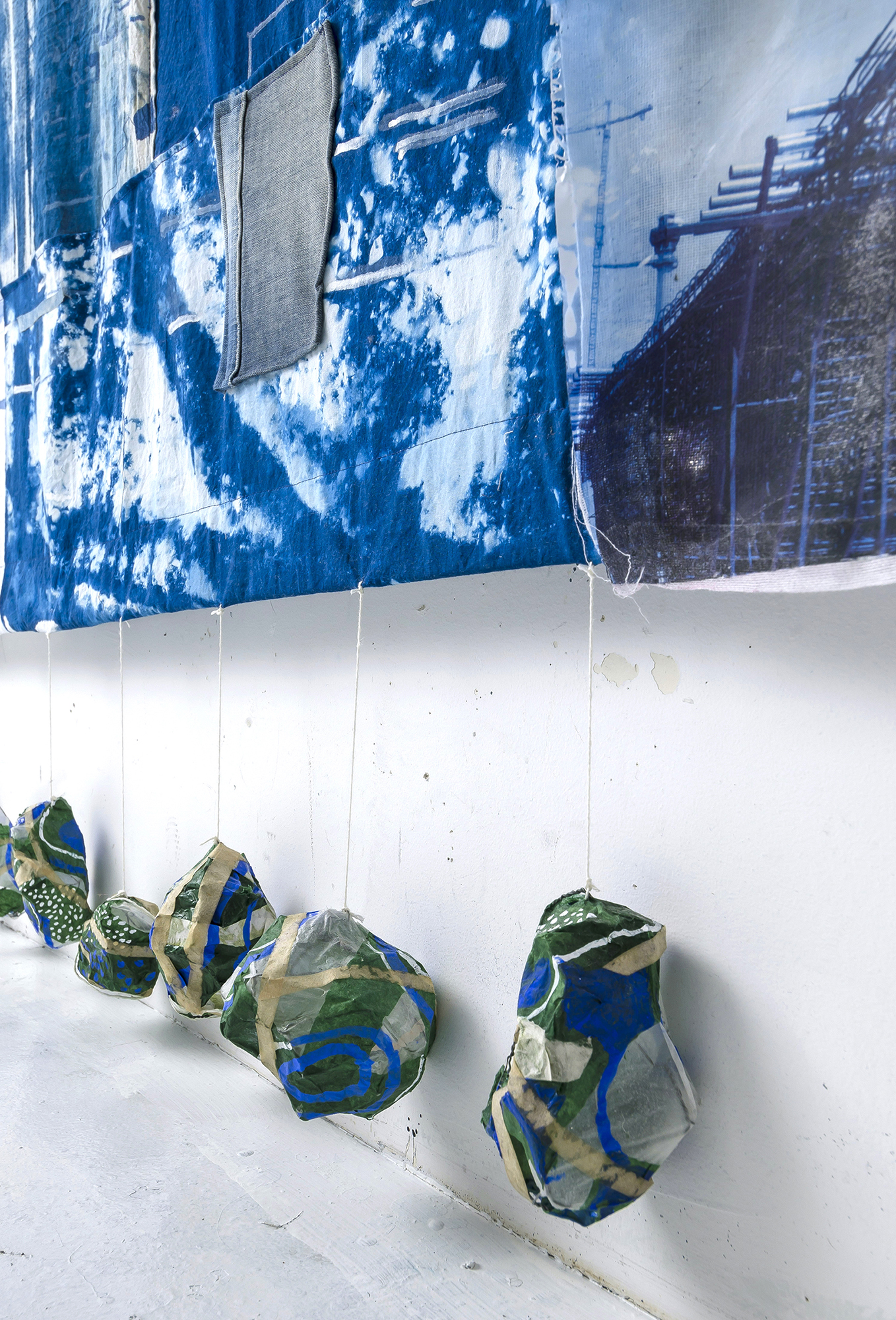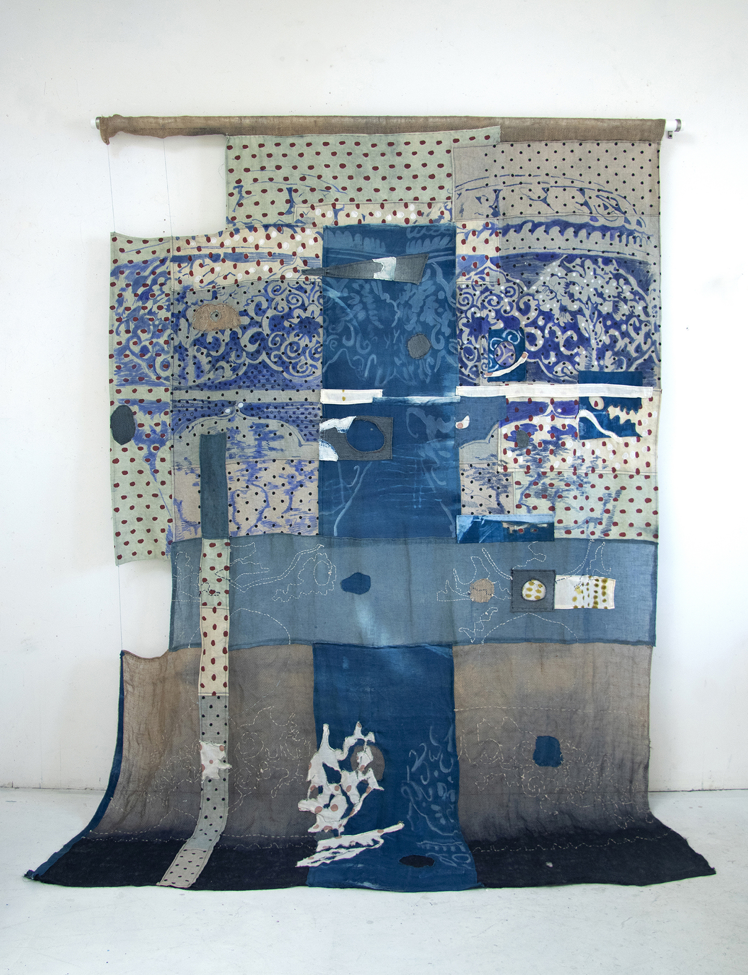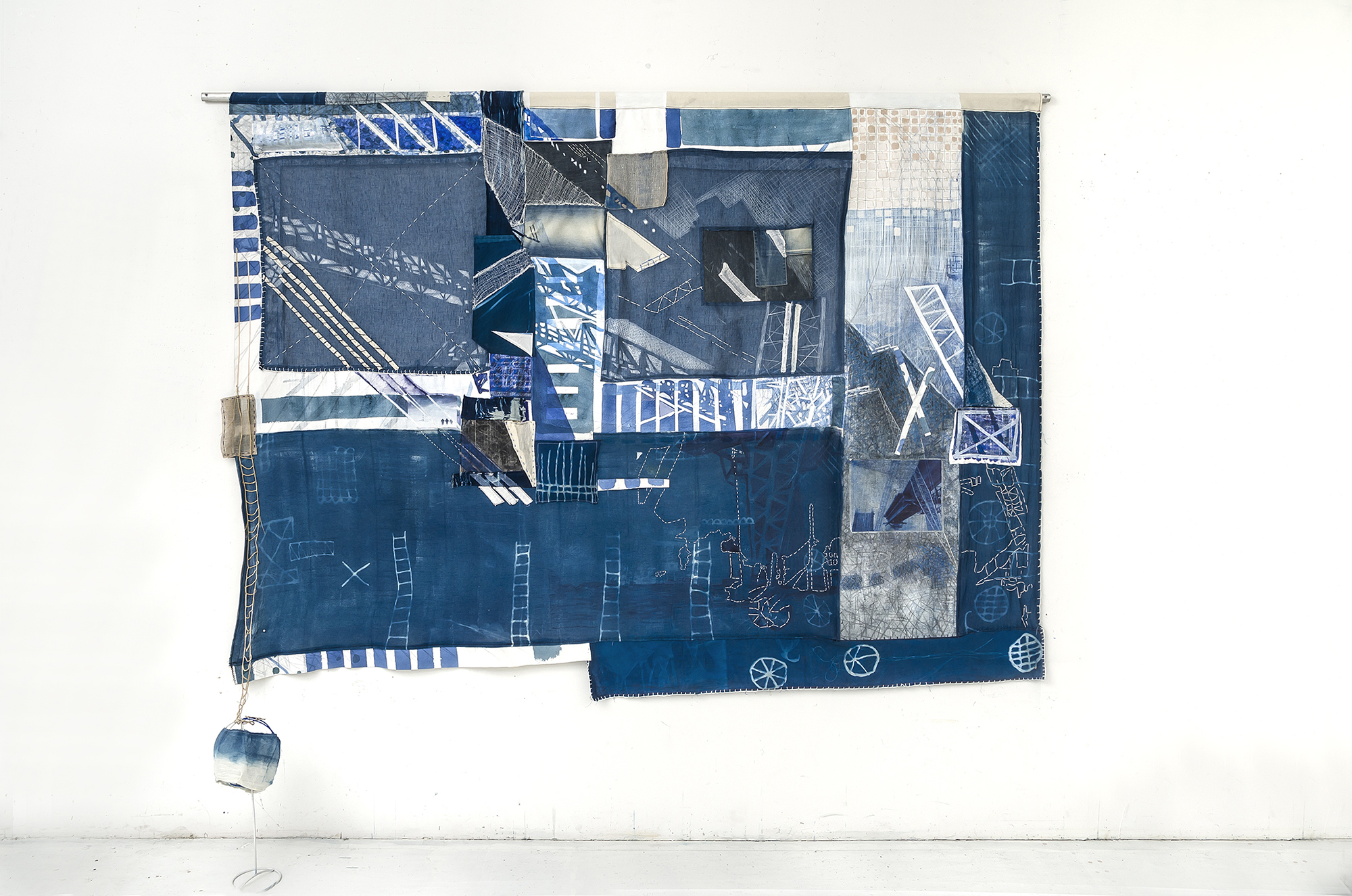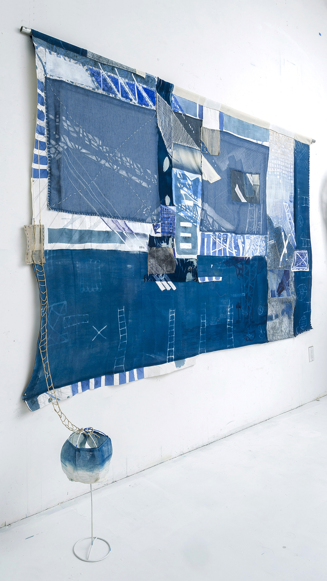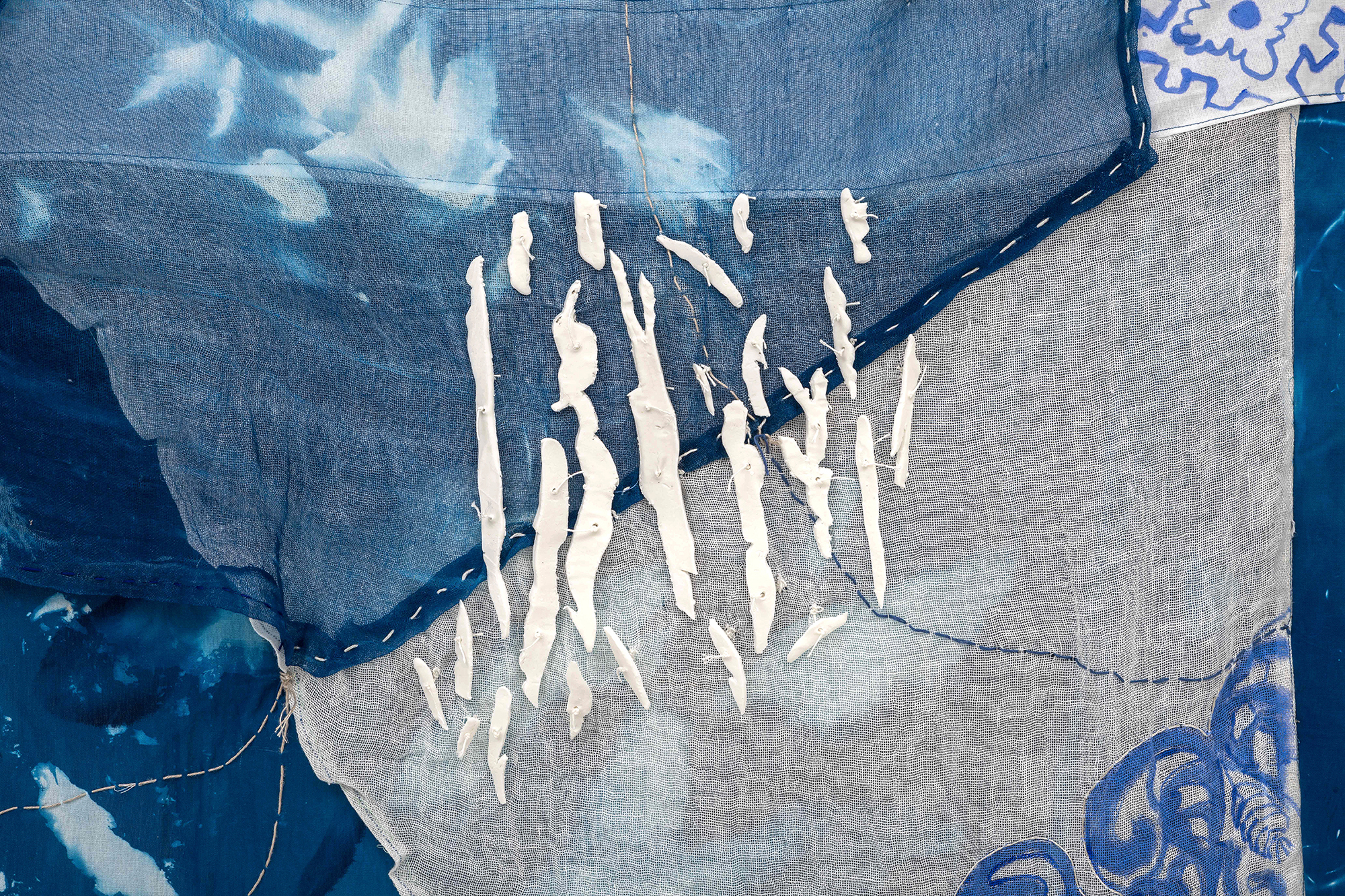 Pigment, indigo, cyanotype, denim, scrim, burlap, embroidery, sewing, steel armature, string and porcelain mount. 90 x 60 x 10 inches