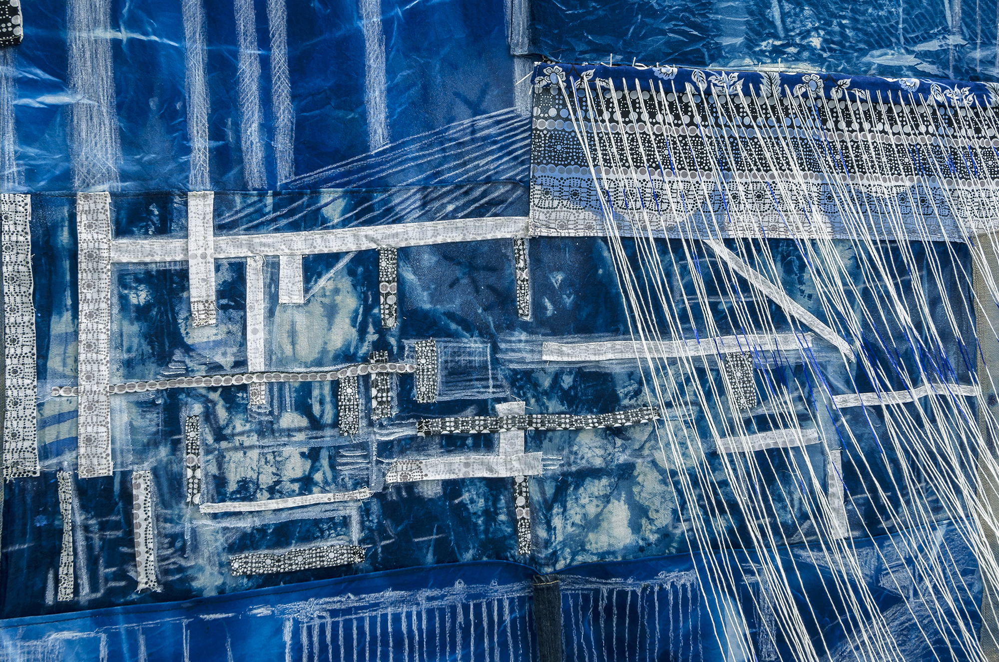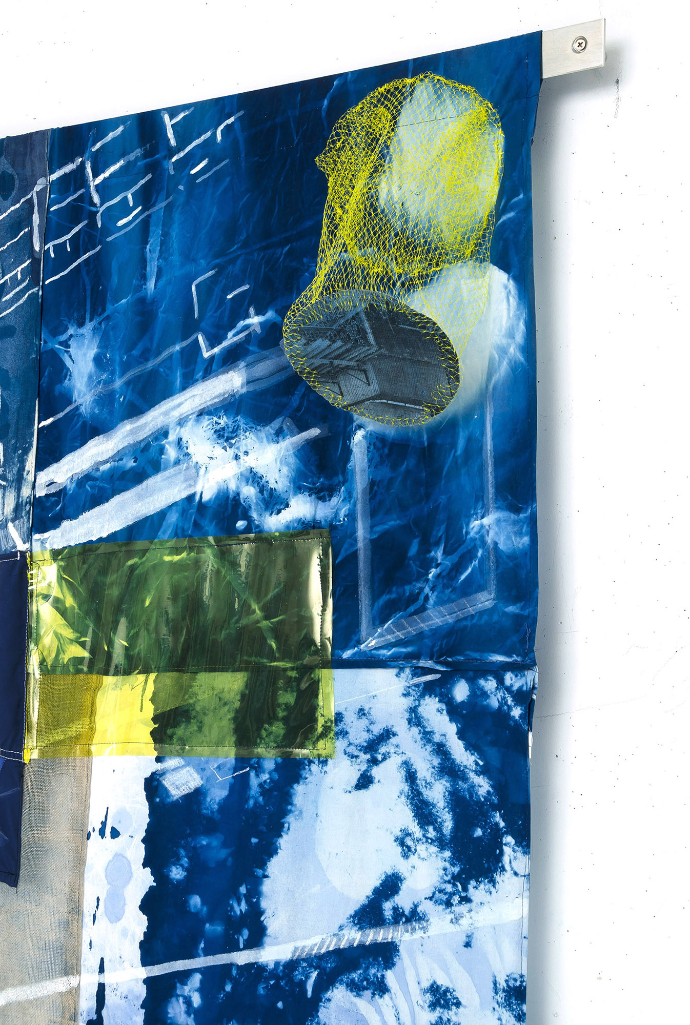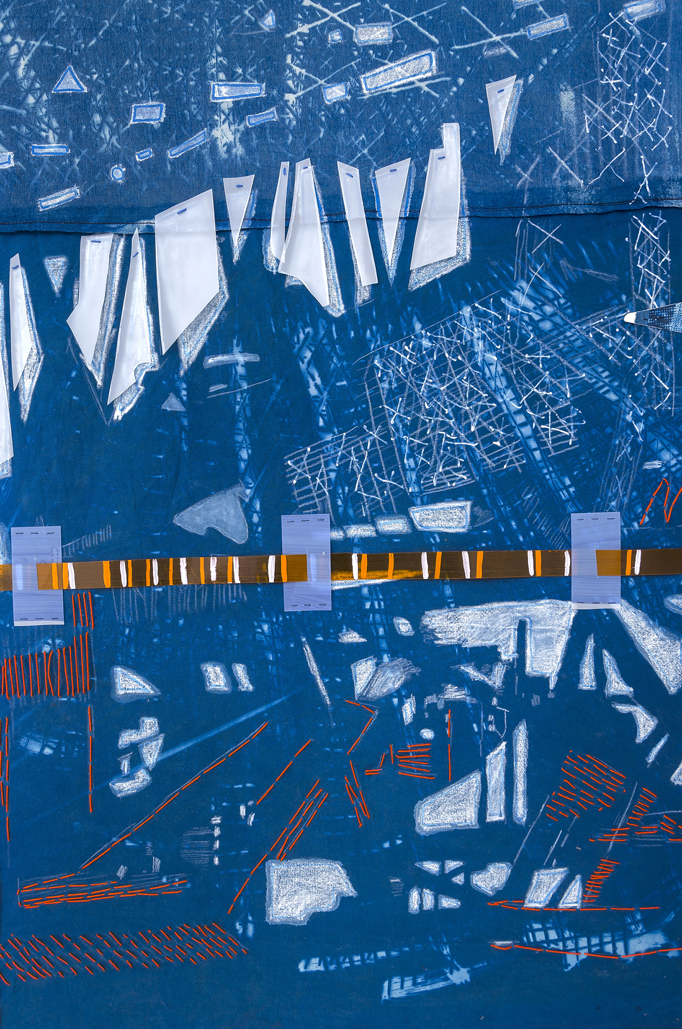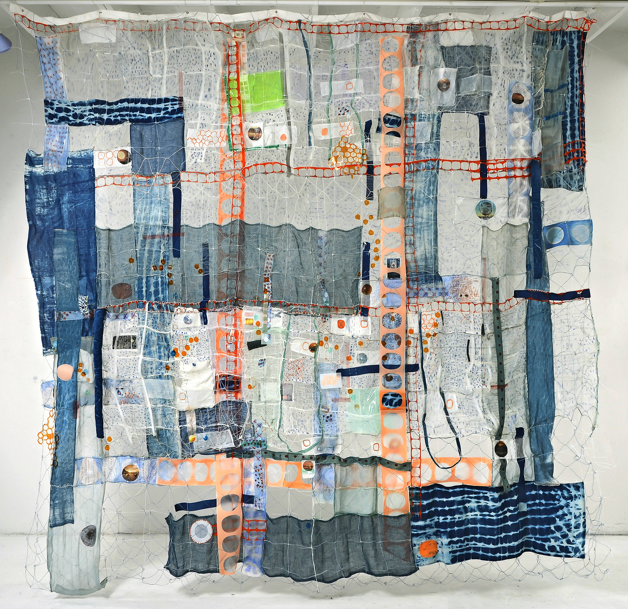 Pigment on Cotton Scrim (5 densities), Cyanotype and Indigo Dye, Drawings on Paper, Image Transfer, Cut and Painted Drafting Film, Tinted Vinyl, Sewing, Collage and Embroidery, Woven through Plastic Grid and Construction Barrier. 120 x 140 inches.