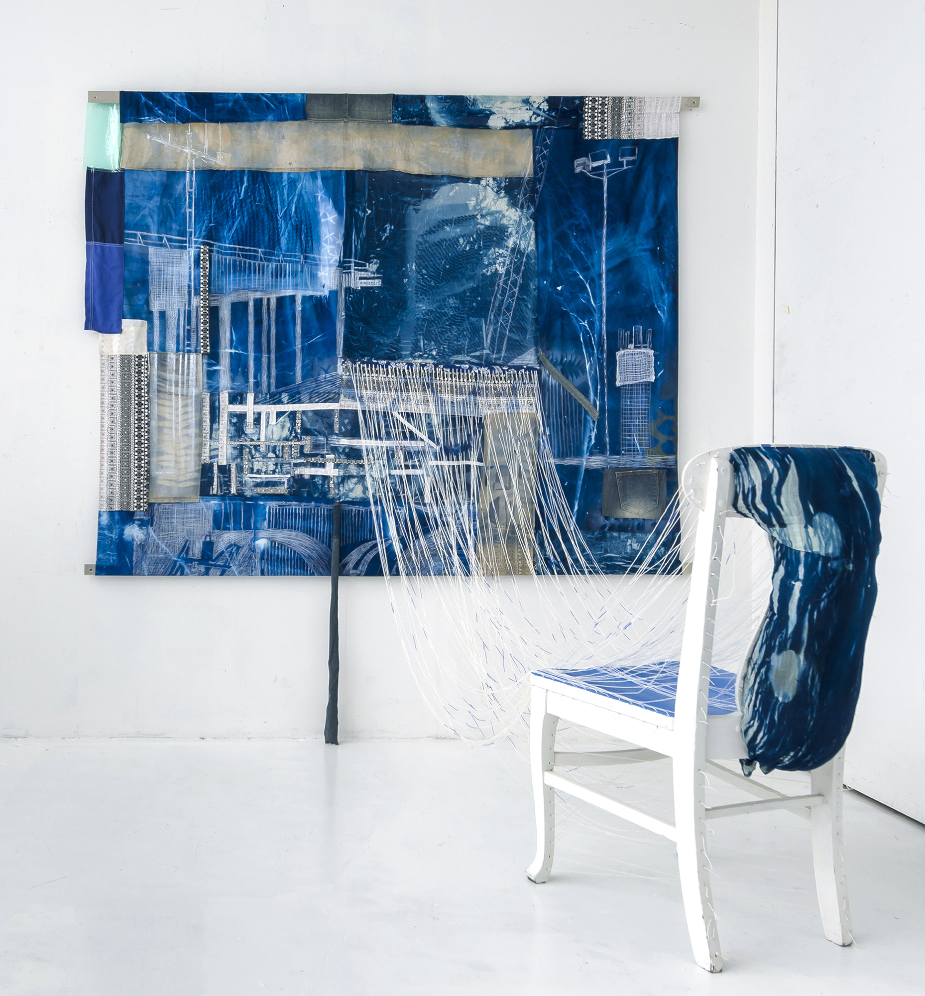 Pigment, crayon and cyanotype on cotton scrim (3 densities) tinted vinyl, denim and patterned fabric. with upholstered chair and painted string extension. suspended 4” away from the wall by metal brackets, 82 x 73 x 56 inches