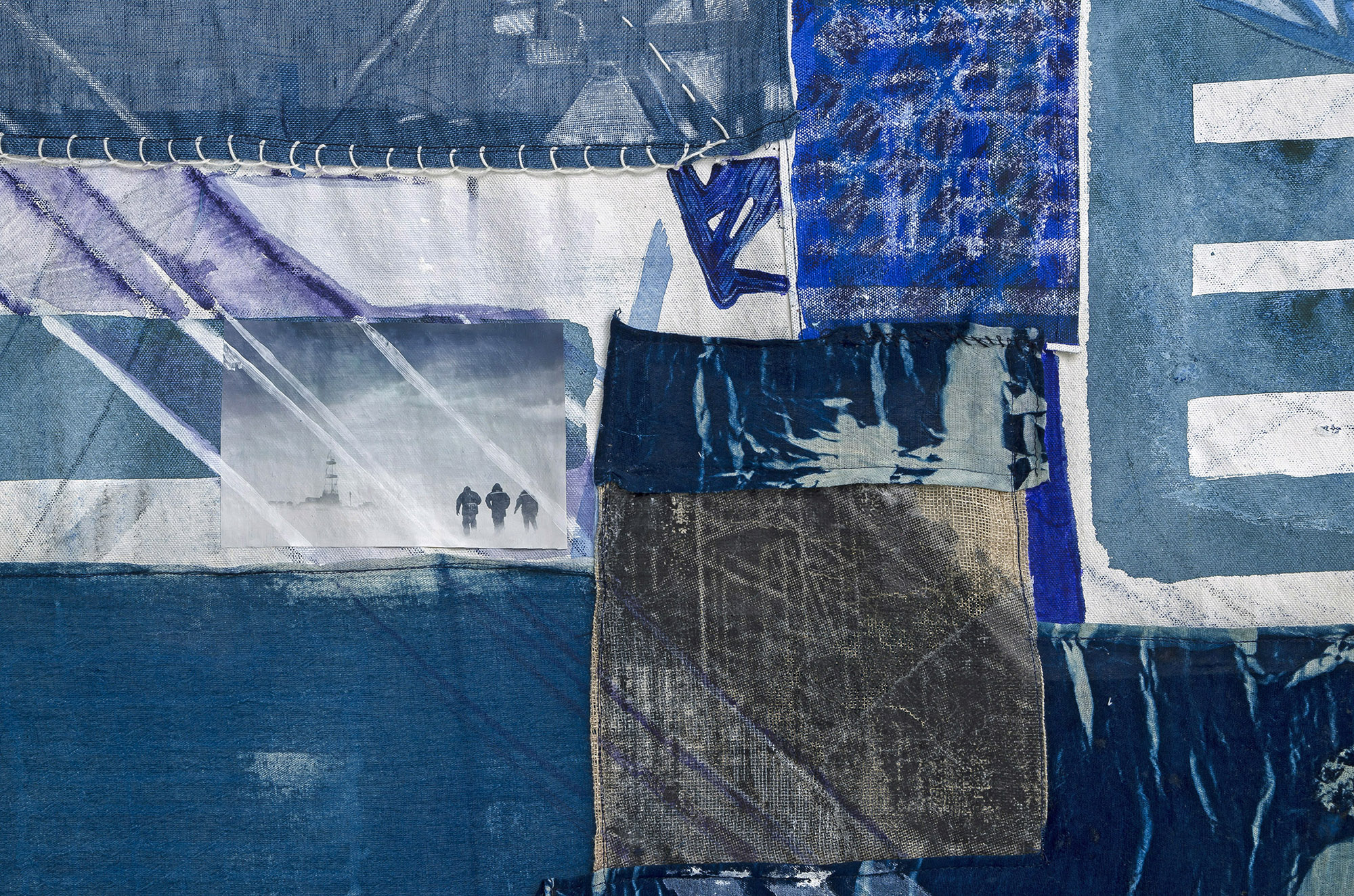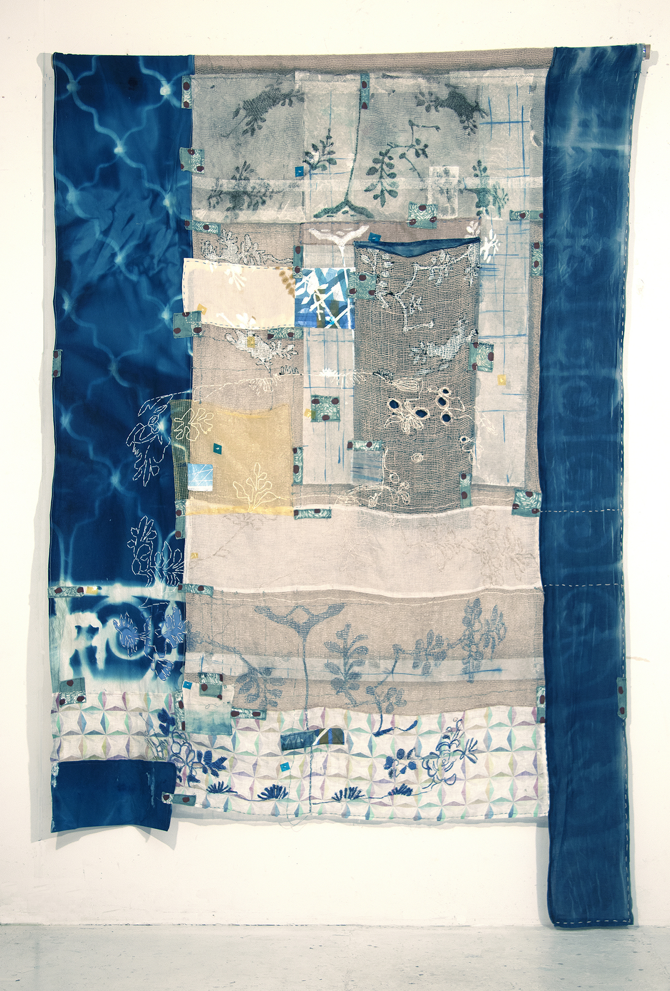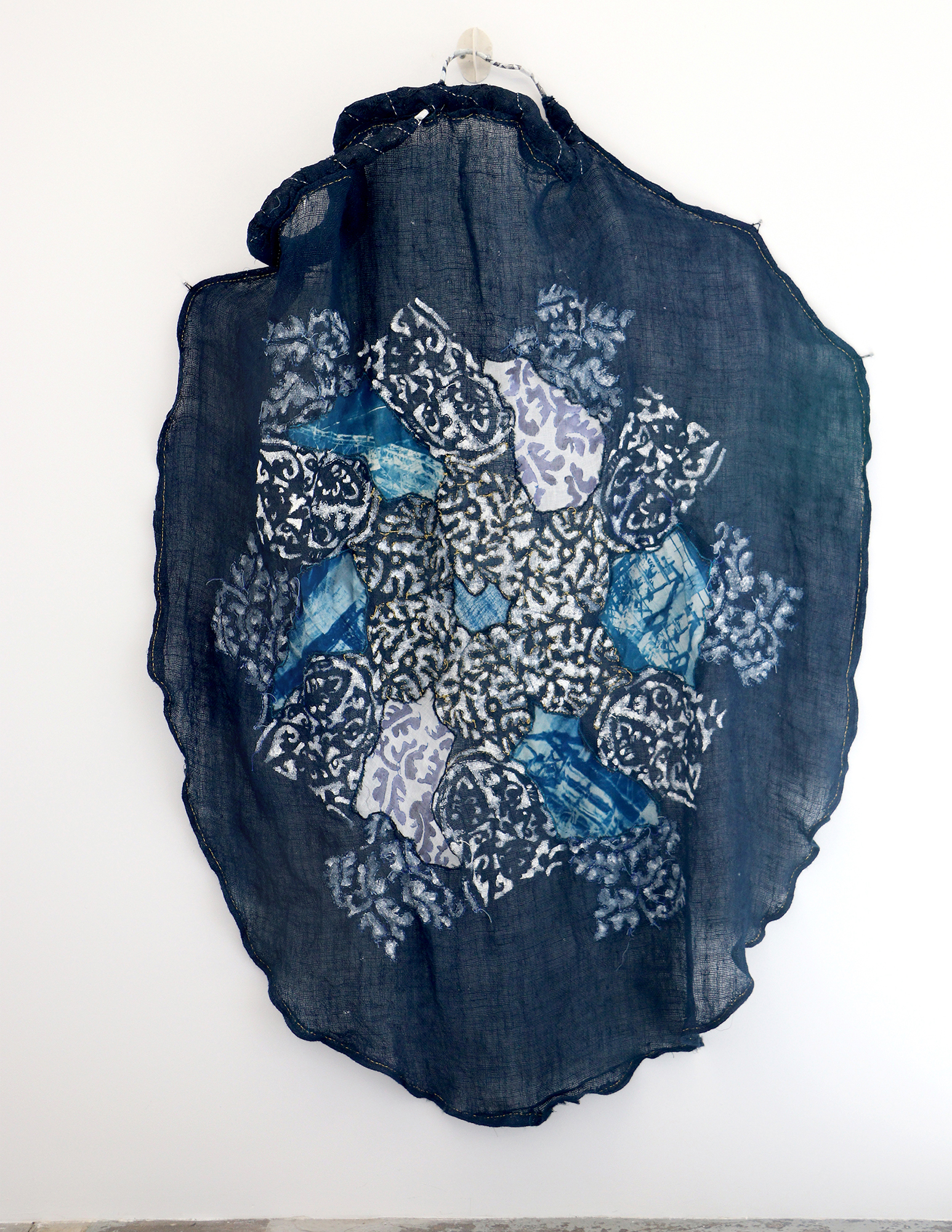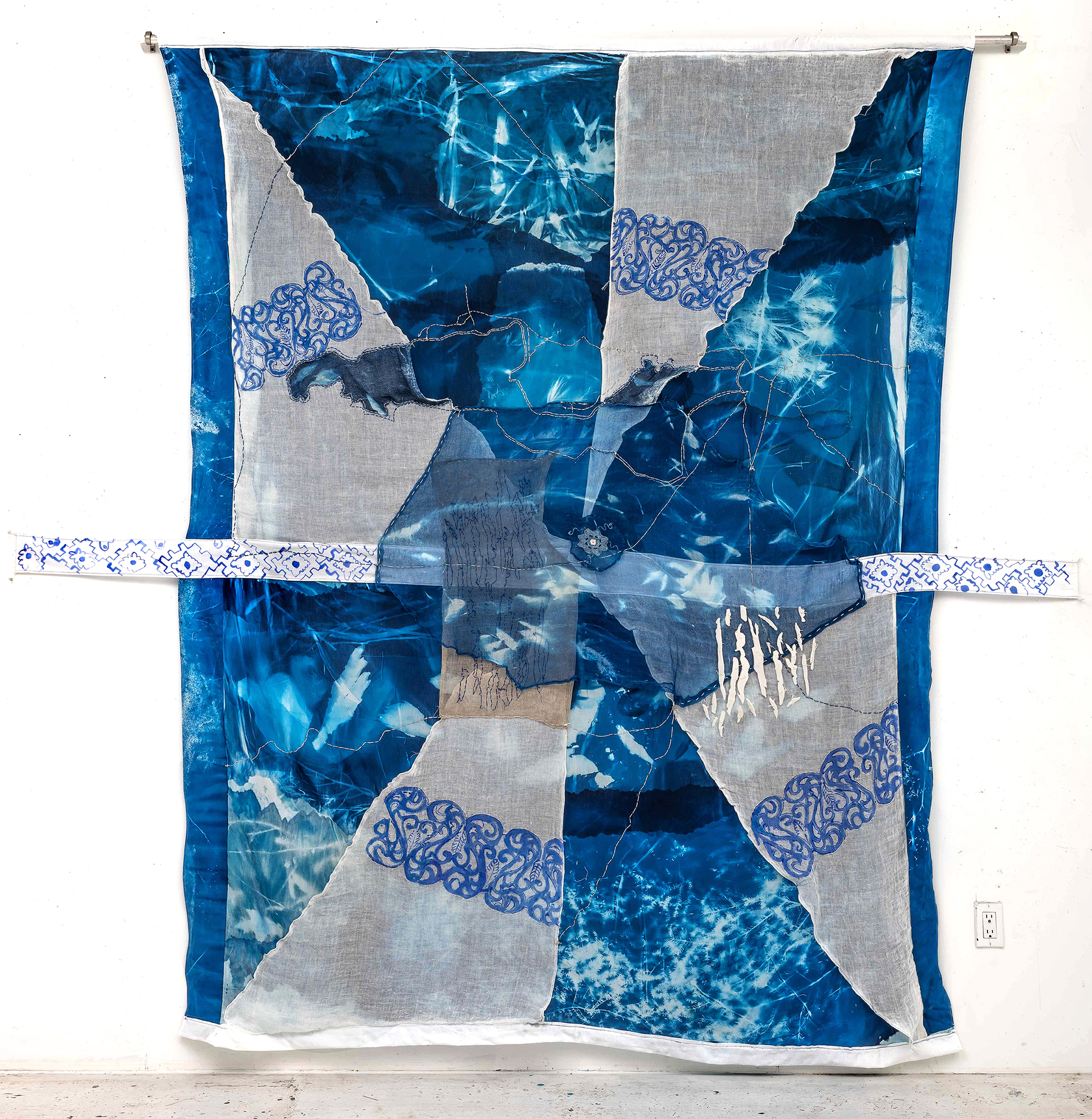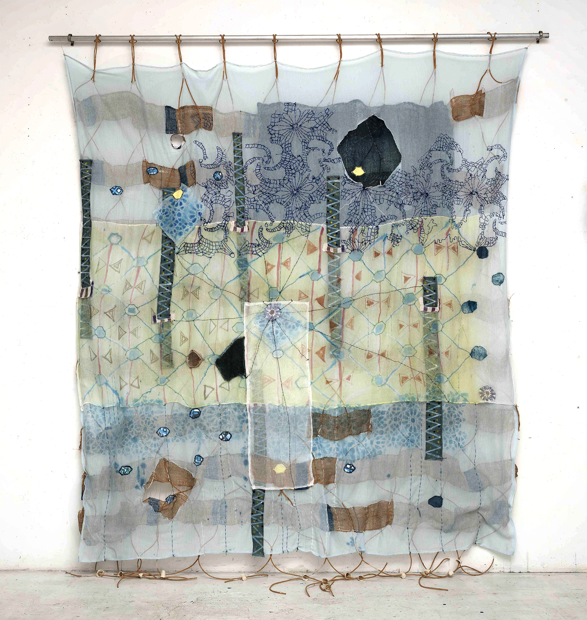 Pigment, cyanotype, cotton scrim (3 densities), netting, embroidery, Suspended from metal bar. Size: 82” x 74”