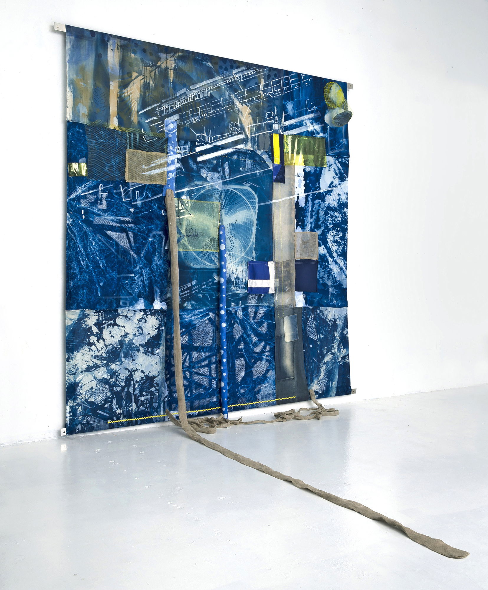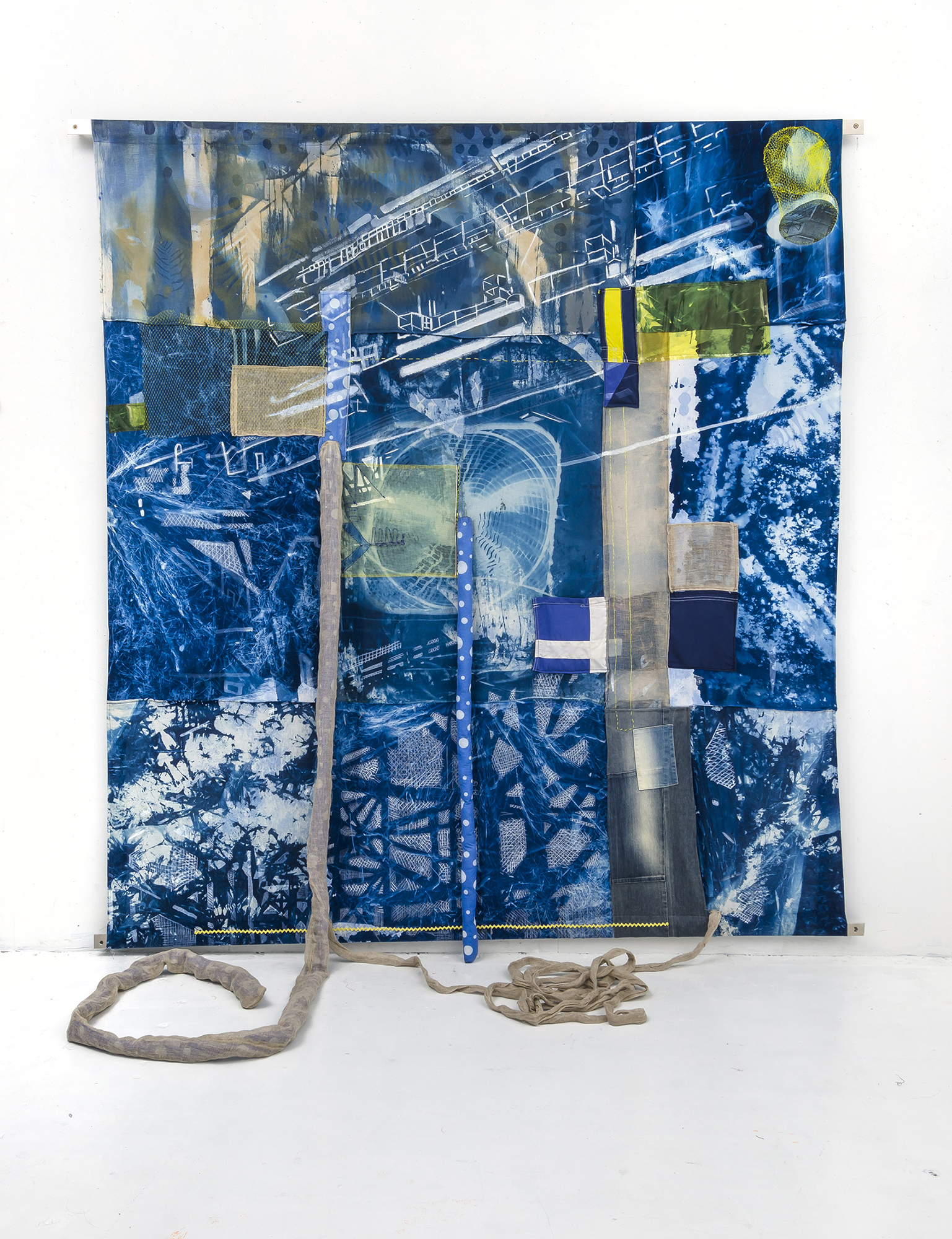 Pigment, pencil, crayon, cyanotype, image transfers, and string on cotton scrim (4 densities), denim and canvas. with fabric, wound rope and metal extension. suspended by aluminum dowel, 86 x 92 x 16 inches