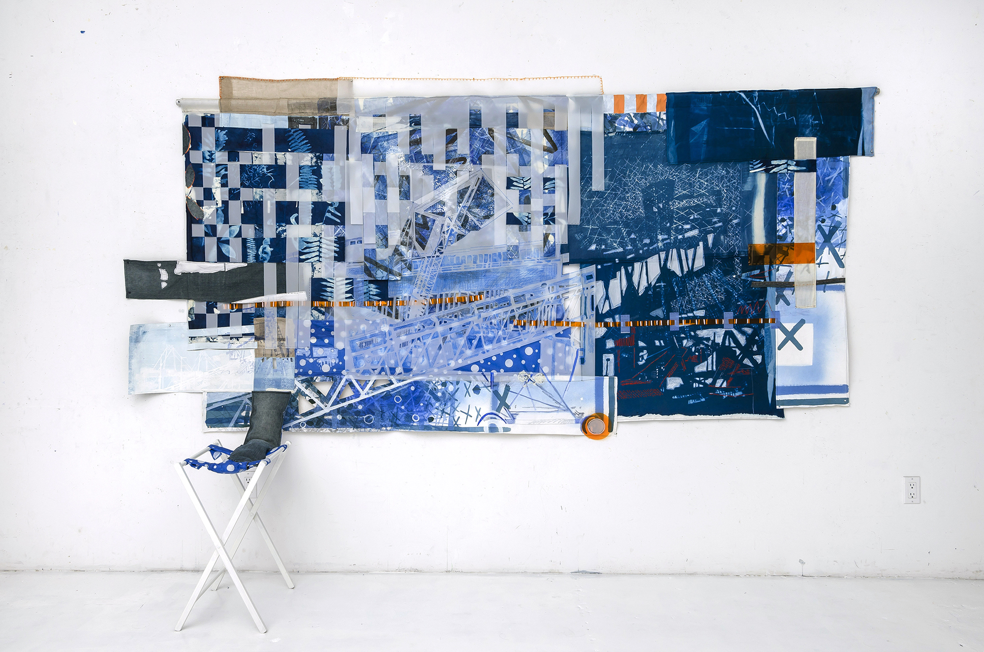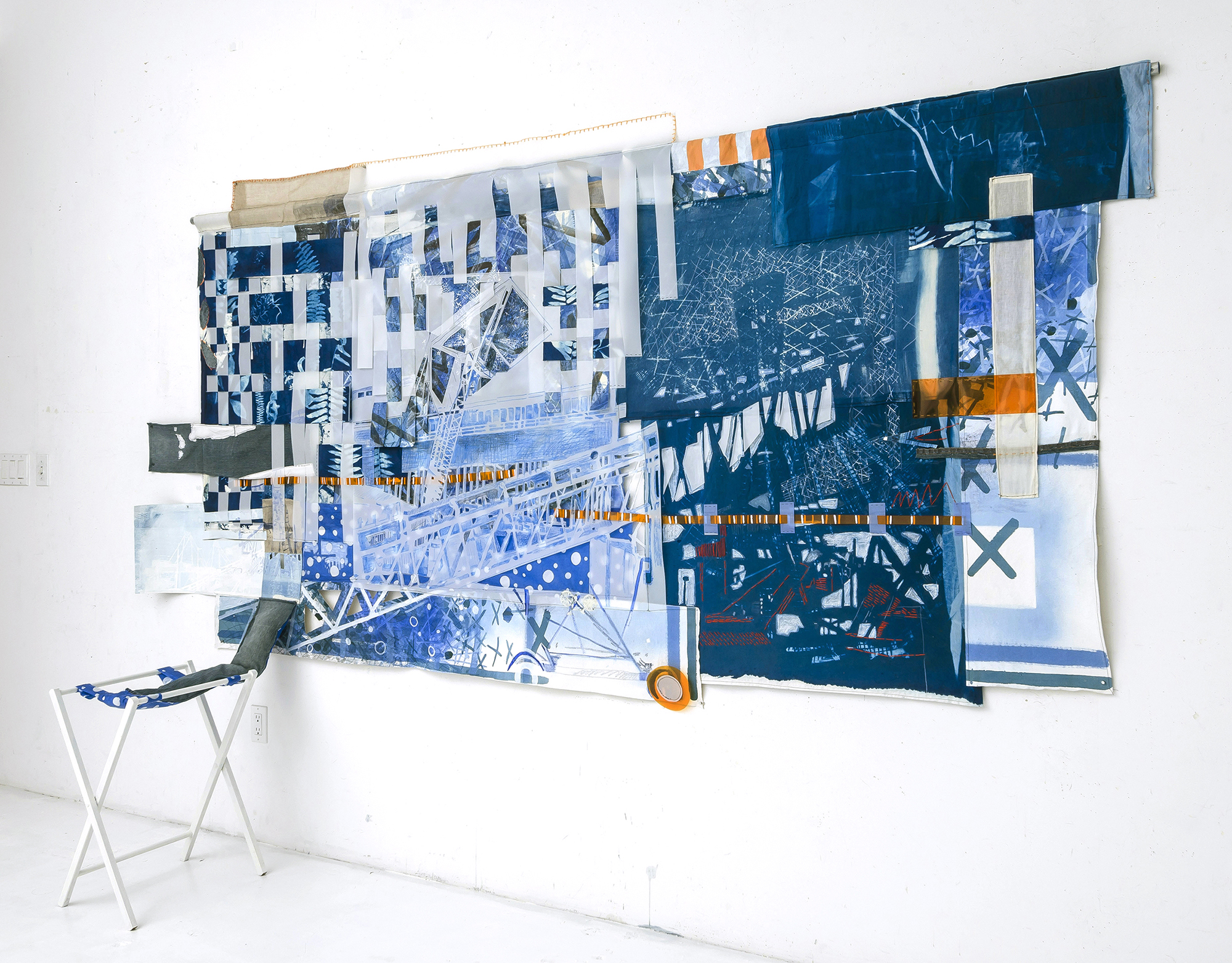 Pigment, crayon, cyanotype, image transfer and embroidery on cotton scrim (3 densities), canvas, denim, patterned fabric, paper, cut drafting film, and tinted vinyl. with fabric and wood extension. suspended by aluminum dowel, 72 x 132 x 26 inches